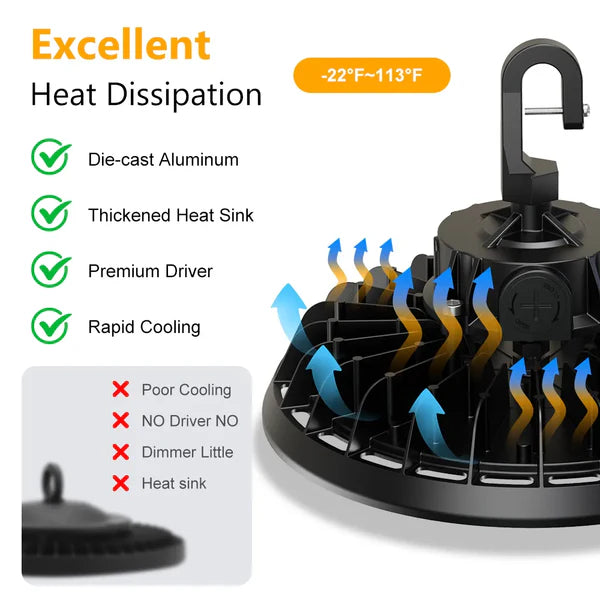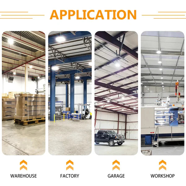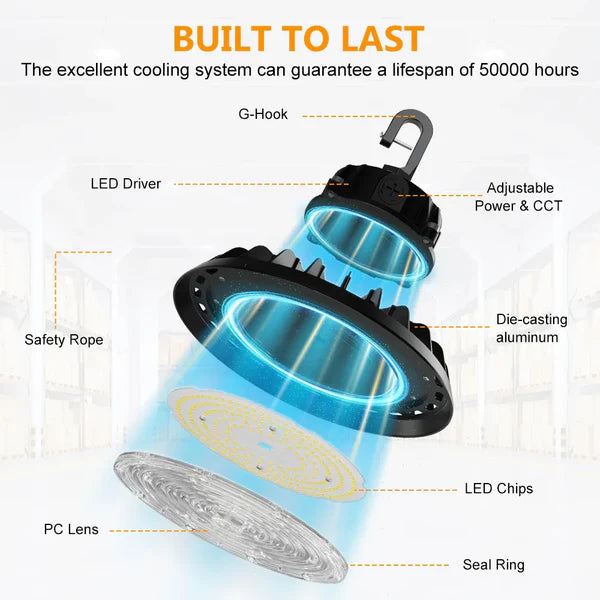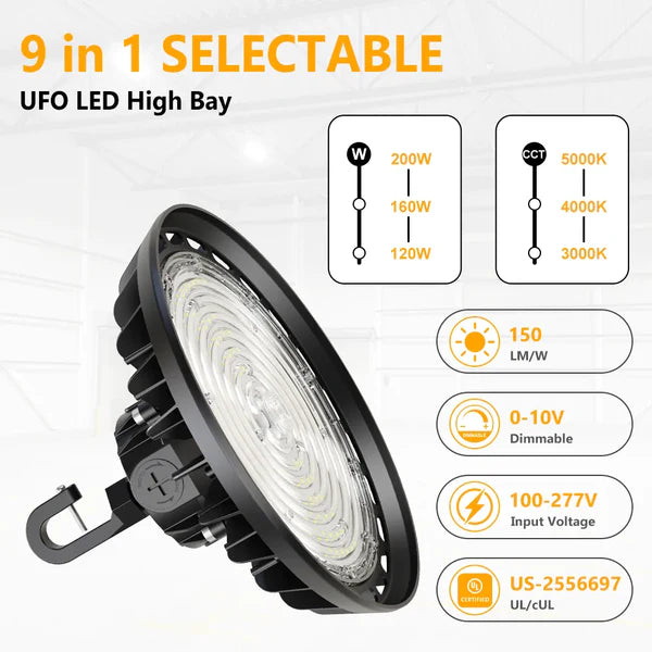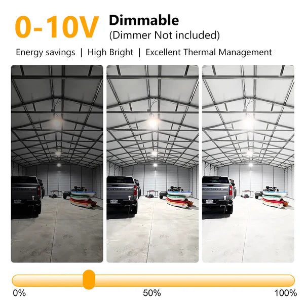 YXL LIGHTING Adjustable LED High Bay Light Series offers customizable on-site adjustments for Wattage and CCT., allowing you to customize your lighting experience. It includes 0-10V dimming for energy conservation.