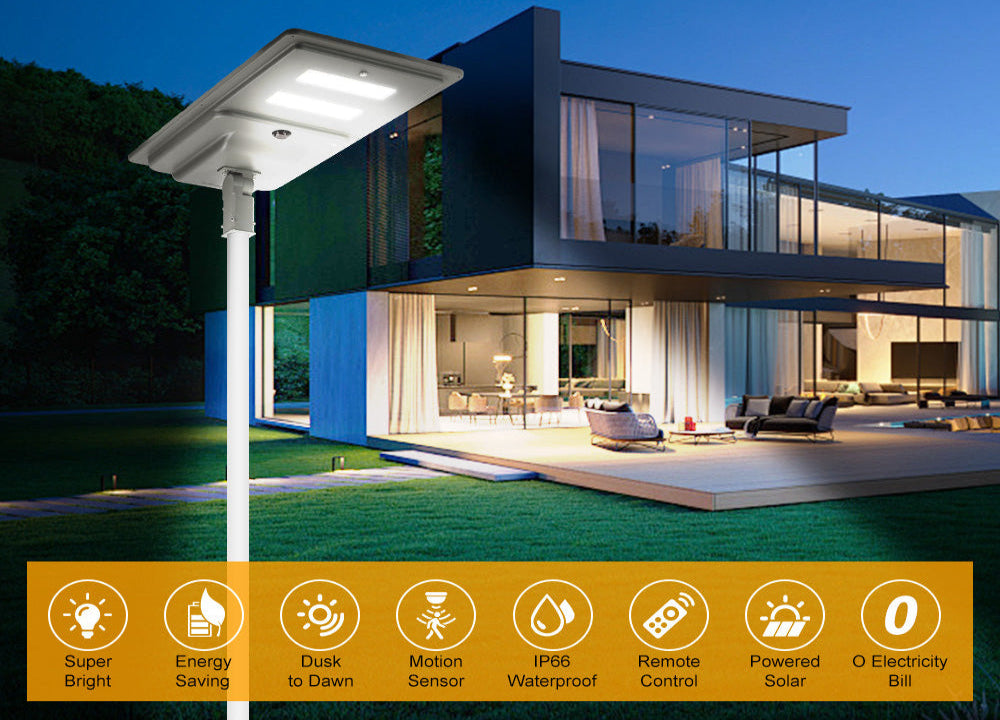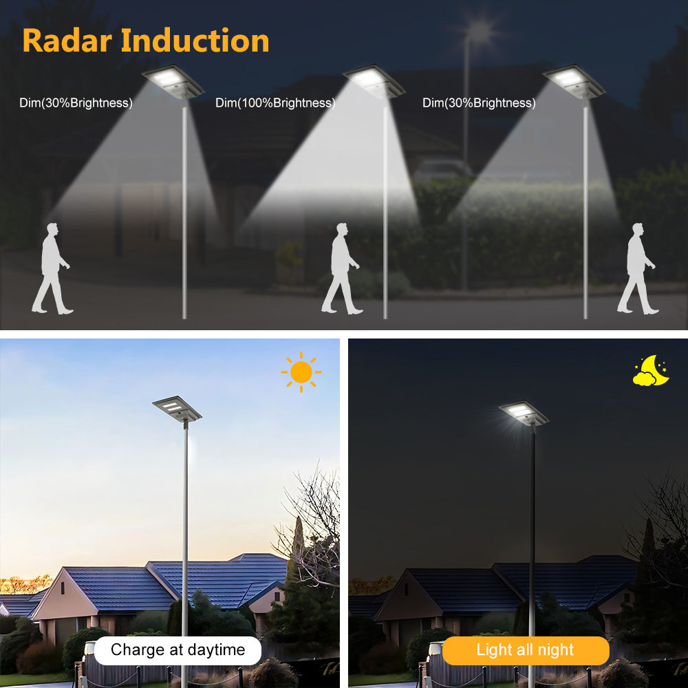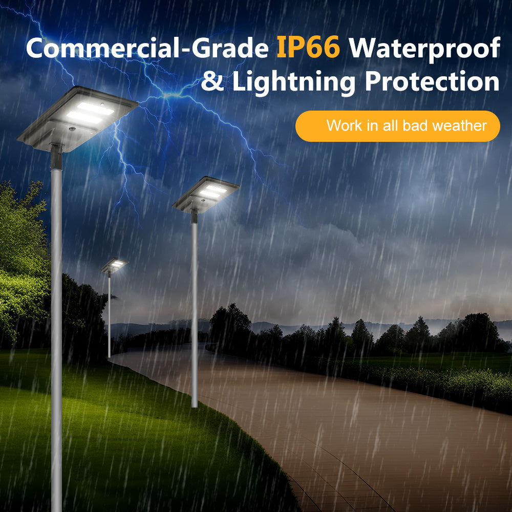 The YXL 80W LED solar street light offers an energy-efficient and cost-effective lighting solution. This plug-and-play unit requires no electricity or grid connection, facilitating quick installation. It boasts a high luminous efficiency, with outputs 18,000 lumens. Equipped with an optional motion sensor, the light automatically intensifies upon detecting movement, enhancing security and conserving energy. Its innovative, high heat resistance, military-grade LiFePO4 battery ensures a long lifespan, while its robust waterproof construction makes it suitable for all weather conditions. It is CE/RoHS approved and comes with a 5-year warranty.