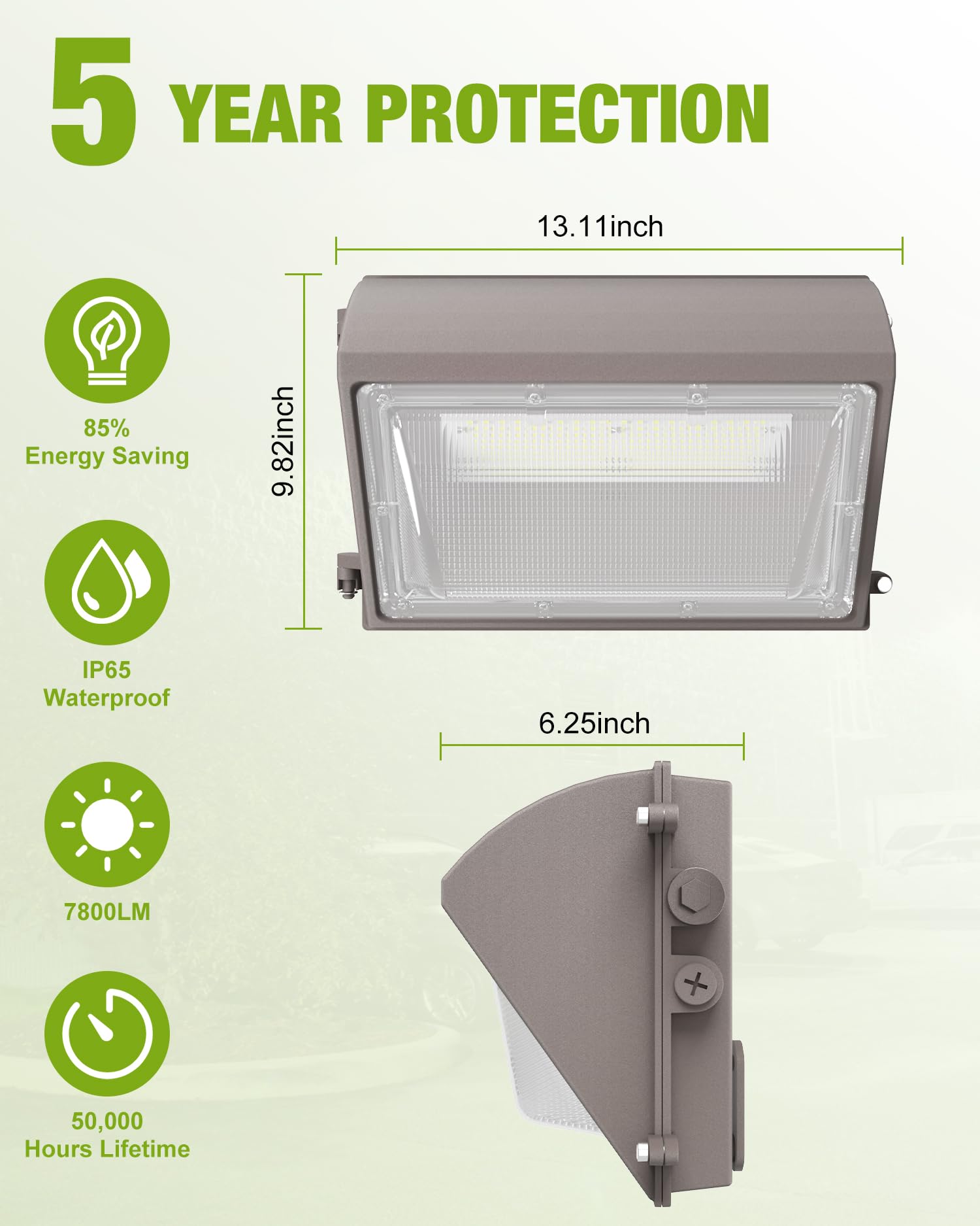 YXL-LIGHTING LED Wall Pack Lights deliver a bright 15,600lm daylight white light with 5000k color temperature, efficiently replacing 600-800W MH/HIP/HID bulbs while saving up to 85% in energy. Featuring durable die-cast aluminum for excellent heat dissipation and a service life of over 50,000 hours, it includes a dusk-to-dawn photocell for automatic operation, enhancing outdoor security and perimeter lighting. With IP65 waterproof, it's suitable for all weather conditions and offers three easy installation methods, including a J-BOX surface mount. Backed by a 5-year warranty.