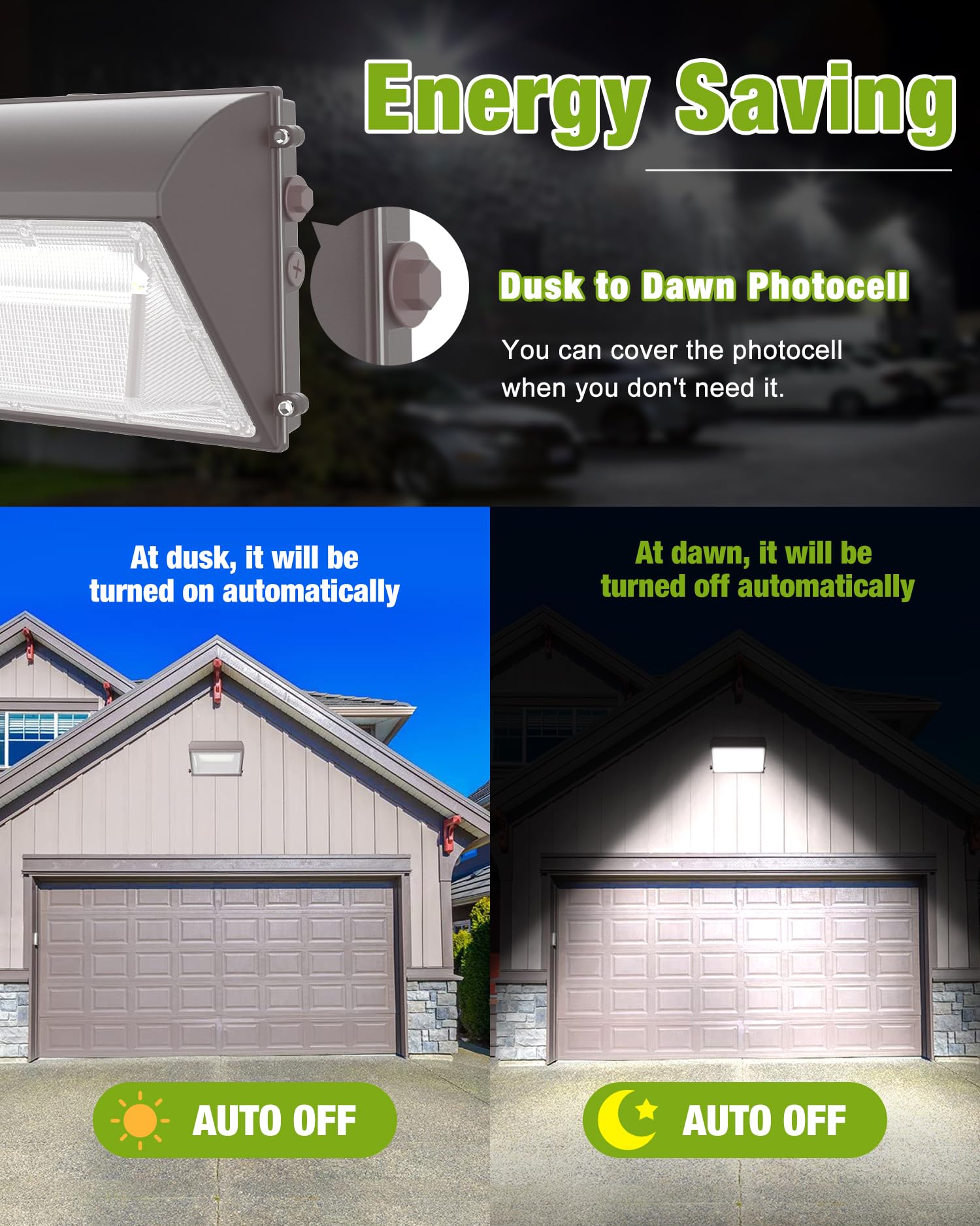 Our wall light has dusk to dawn photocell, automatically turned on/off at the night/sunrise.It's wide voltage range from 100V to 277V and IP65 waterproof to resist rain in outdoor.