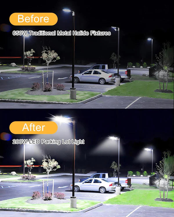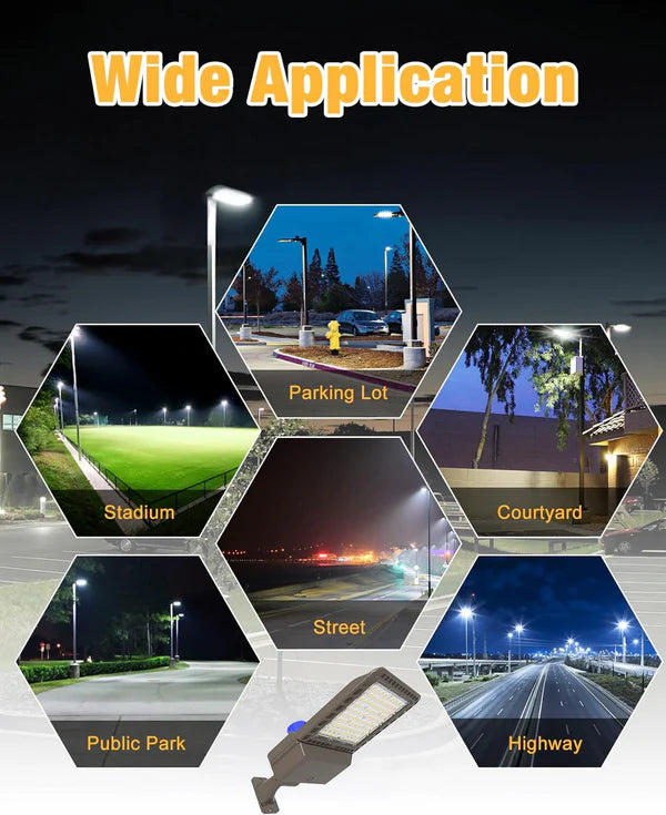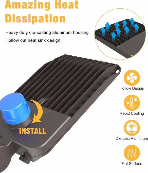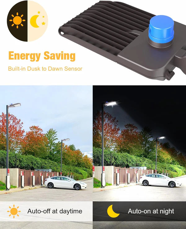 YXL LIGHTING LED Parking Lot lighting fixture includes a Dusk to Dawn photocell sensor and 0-10V dimming. It features a durable, aluminum alloy housing and is easily installed in parking lots, campuses, stadiums, or as a replacement for streetlights. ETL/FCC/RoHS are approval, as a testament to its exceptional quality, it comes with a generous 5-year warranty.