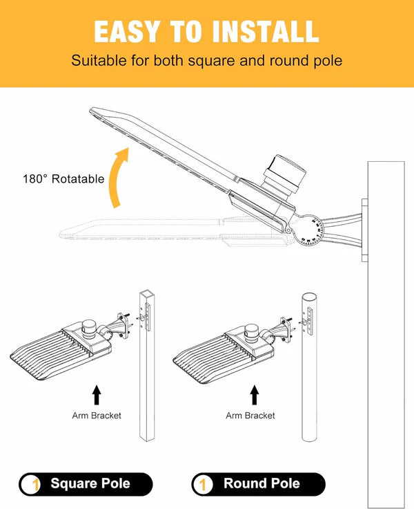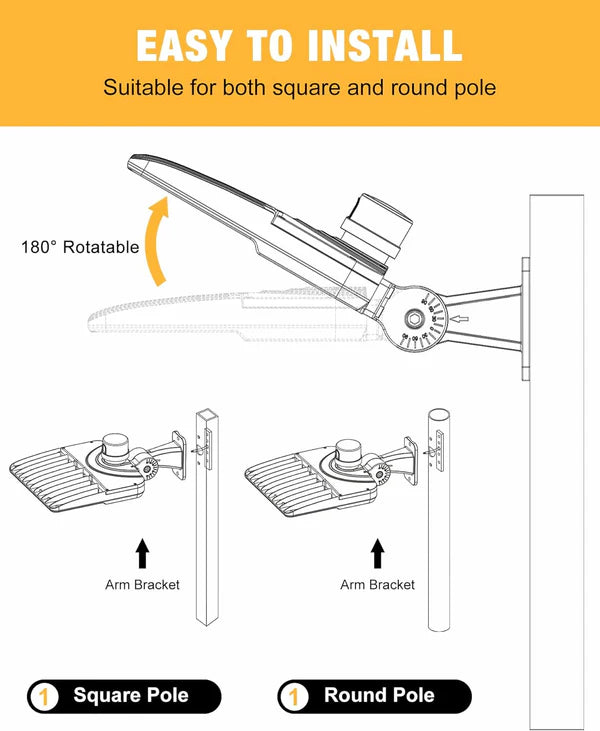 Square/round pole arm mount and wall mount. 180° adjustable light head is easy to change light direction for lighting up large areas.
