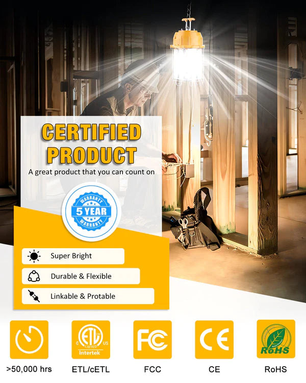 YXL LIGHTING presents to you the LED Temporary Work Light Pro Series of 60W power which an excellent source of light for construction jobsite and maintenance activates with features designed to fit any application. The Lumen yield of this light fixture is 7,200. The lamps also come with a 120v 5-15P US plug with a 10-foot cord and an 18AWG cord type. ETL/FCC/RoHS are approval, as a testament to its exceptional quality, it comes with a generous 5-year warranty.