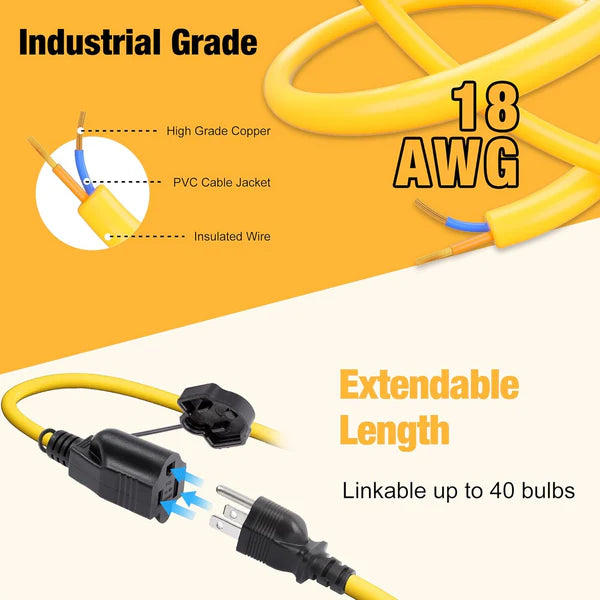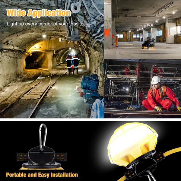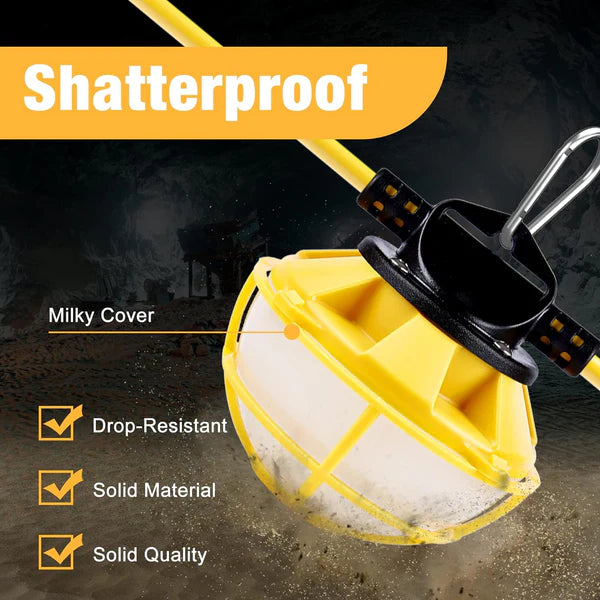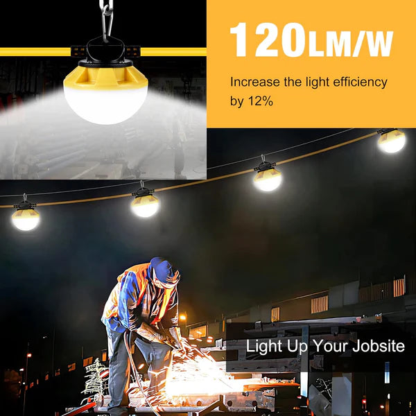 YXL LIGHTING LED Construction String Light Round series 50W 6,000lm or 100W 16,000lm with 5 light bulbs or 10 light bulbs spaced 10 feet apart, overall length of 50 foot, each light includes a carabiner to make installation simple. The work lights are an excellent alternative to traditional incandescent lights, you can leave it as a permanent installation to light the way for others or use it to brighten other areas such as job sites, construction sites, mines, campgrounds, attics, basements, storage areas, stairwells, outdoor markets, marinas, or anywhere extra light is needed. ETL/FCC/RoHS are approval, as a testament to its exceptional quality, it comes with a generous 5-year warranty.