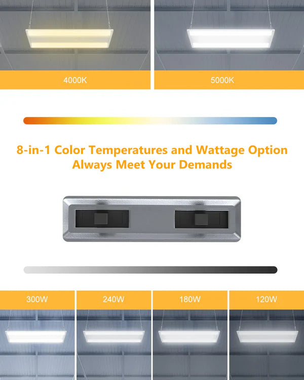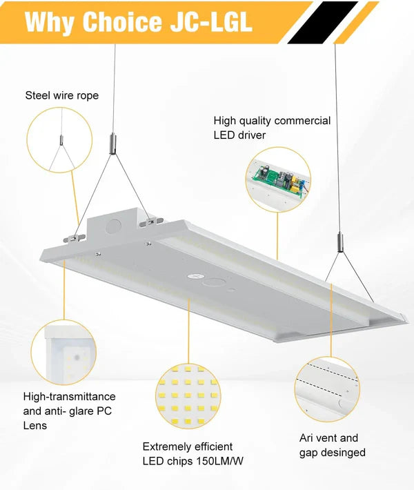 The YXL-LIGHTING LED linear high bay light adopts high efficiency LED chip, the luminous efficacy is up to 150LM/W. The device offers adjustable wattage and correlated color temperature (CCT) functionality. Specifically, wattage can be configured to 100%, 80%, 60%, or 40%, while CCT is selectable between 4000K and 5000K. This light are made of rugged cold-rolled steel plate corrosion-resistant housing, and an excellent thermal management system effectively extends the service life of the fixture. Ultra-Compact, strudy design saves freight and space on lifts and racks during instllation, making it ideal for warehousing, large indoor spaces, retail and commercial applications.
